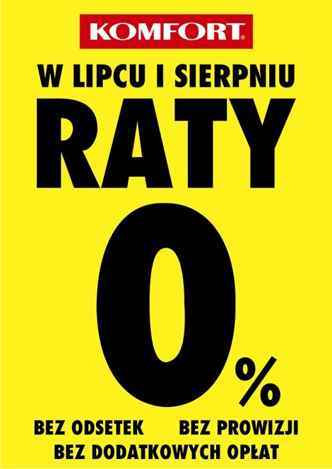 Jeszcze tylko do końca sierpnia br. Sklepy Komfort oferują atrakcyjny system ratalny. Raty 0%, bez żadnych ukrytych kosztów i prowizji obowiązują na cały asortyment. Klienci mogą skorzystać z oferty kredytowej na zakupy o wartości nawet do 20 tysięcy złotych. W zależności od preferencji kupującego kwota może zostać rozłożona na 10 lub 20 rat.