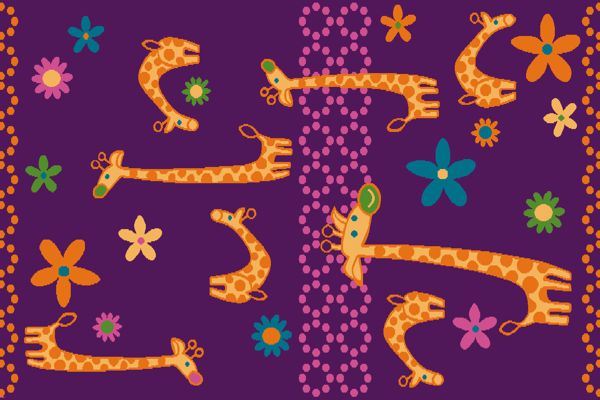 Dywan GIRAFFE z racji pięknej, intensywnej kolorystyki w odcieniach fioletu, różu i pomarańczy polecany jest do pokoi małych księżniczek. Wykonany z przędzy polipropylenowej. Wymiary 133 x 180 cm. Cena w Sklepach Komfort i na www.komfort.pl 229 zł.